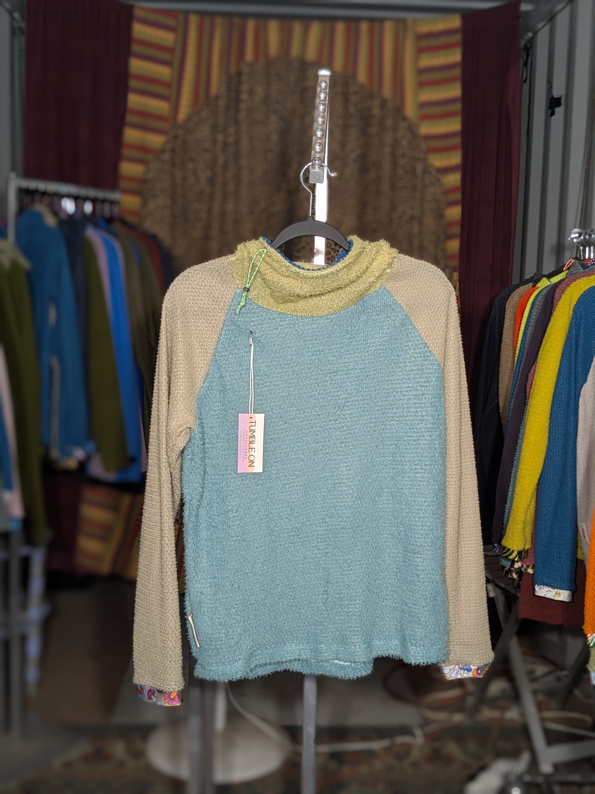 Light 90 shades - Eggshell 90 Body, Mid Grey Arms, Light grey hood, Teal Hood ring, Cottage Core Cuffs, Purple and Yellow Drawstring